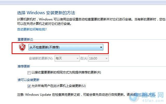 5、选择“从不检查更新”、