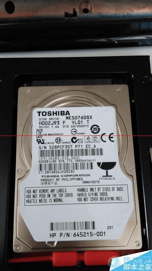 6、把送的四个塑料小螺丝扭到原来的机械硬盘上;塞进光驱位硬盘托架,向上滑进接口,把红色软胶条塞到底部;系统安装好后,关机,把光驱位硬盘托架装回去,用螺丝固定。