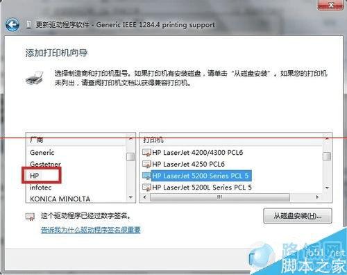8、左侧厂商选择HP,右侧打印机的型号选择HP Laserjet 5200 Series PCL5,选择下一步。如下图8