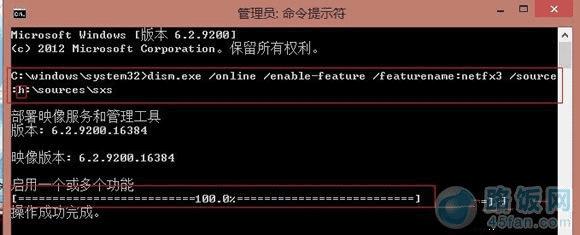 然后在命令里输入dism.exe/online/enable-feature/featurename:NetFX3 /Source:H:sourcessxs(“H”为我的虚拟光驱的盘符)。