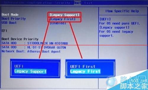 (3)在计算机重新启动至“Lenovo“LOGO画面时,并按下笔记本键盘上“F2”键或“Fn键+”F2“键进入笔记本的BIOS设置界面(若您的笔记本为Y400、Y500请您在计算机重新启动至“Lenovo“LOGO画面时按下笔记本的电源开关关闭计算机之后,按下”一键恢复按”钮开机,通过选择启动菜单中的“BIOS Setup”项目再次进入BIOS设置界面)将按下键盘上“→”键菜单移动至“Boot“项目,找到该项目下的”Boot Mode“选项,按下“回车”键打开该选项的设置菜单,按下键盘上“↓”按键,将该选项默认的”UEFI“修改为”Legacy Support“之后按下“回车”键确认,再按下键盘上“↓”按键选择”Boot Priority“选项,按下键盘上“↓”按键将该选项默认的”UEFI First“修改为”Legacy First“之后按下“回车”键确认。之后再按下笔记本键盘上“F10”键或“Fn键+”F10“键启动BIOS保存设置窗口,在该窗口中直接按下笔记本键盘上的”回车“键启动BIOS保存设置并重新启动计算机功能。