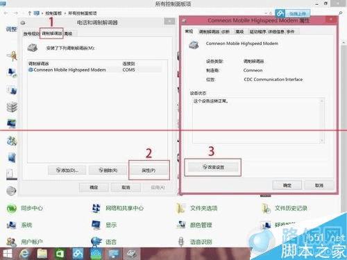 3、选择电话和调制解调器首次启动可能会需要填写区号,比如青岛是0532,北京是010,填一下点击确定即可切到“调制解调器”选项卡点击“属性,点击“改变设置