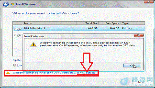 即:Windows无法安装到这个磁盘,选中的磁盘具有MBR分区表。在EFI系统上,Windows只能安装到GPT磁盘。