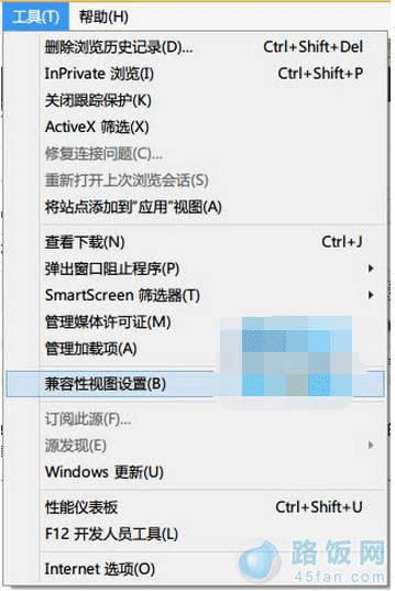 第三步,返回到浏览器窗口,在窗口菜单中找到并点击工具选项,工具下面出现很多选项项目,在这些选择项目中找到并点击兼容性视图设置选项,系统会呈现兼容性视图窗口,在添加此网址下面的方框中输入出现故障的网址,输入完成之后使用鼠标点击窗口右边的添加按钮。