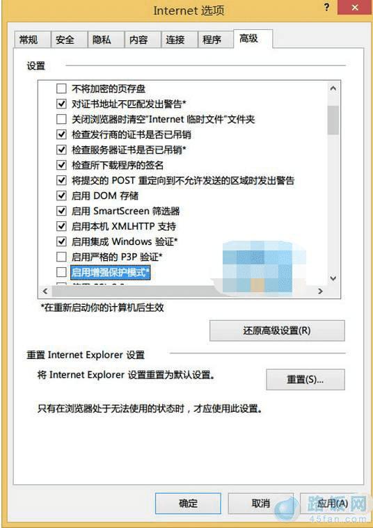 第二步,在窗口中找到设置,在设置下面的方框中找到启动增强保护模式选项,使用鼠标将选项前面方框中的对号去掉,然后点击窗口最下面的确定按钮,可以解决浏览器页面无法显示问题,如果仍然无法解决可以按照下面的步骤操作。