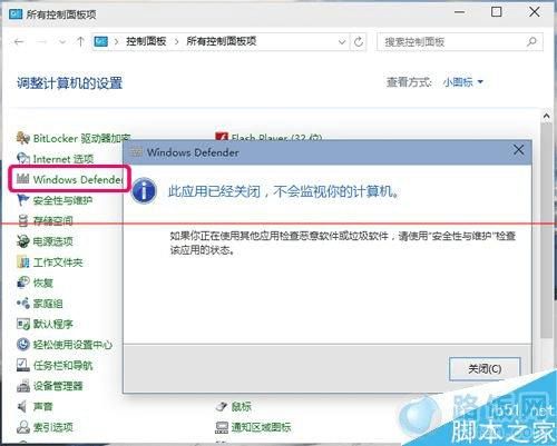 6、病毒库下载完成后,直接打开执行病毒库更新操作,更新完成后,打开控制面板,点击进入Windows Defender选择关闭