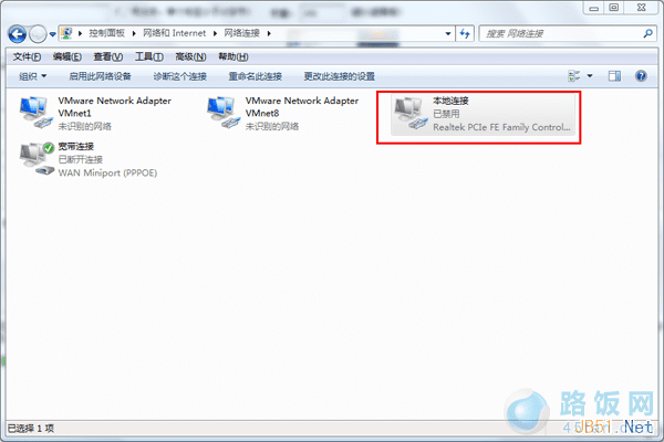 5.此时会打开如下界面,可以找到“本地连接”的图标,此时我们可以看到本地连接显示为“已禁用”的状态,所以会出现网络连不上等一系列网络问题,选择本地连接使用鼠标右键后选择“启用”即可让网络恢复启用