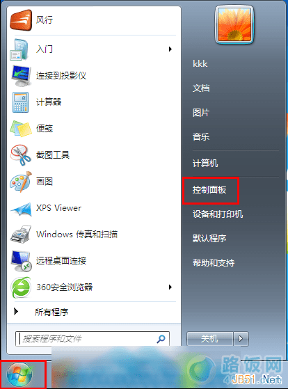 1.点击左下角的开始菜单,选择“控制面板”