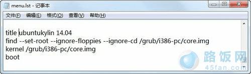 4、修改menu.lst,添加加载Ubuntu的菜单。添加的菜单可能如下所示: