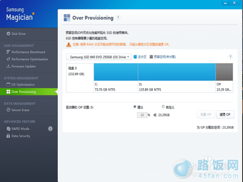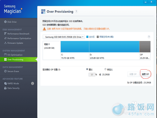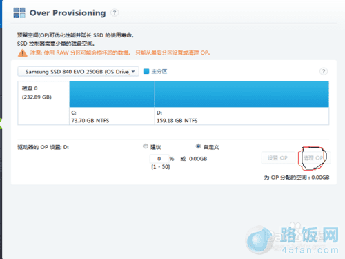 预留空间可以优化性能,延长寿命,但新盘或短时间借用一下空间,浪费10%比较可惜,点击右下角的清理OP。另外这个OP只要硬盘上有剩余空间,随时可以重新设置