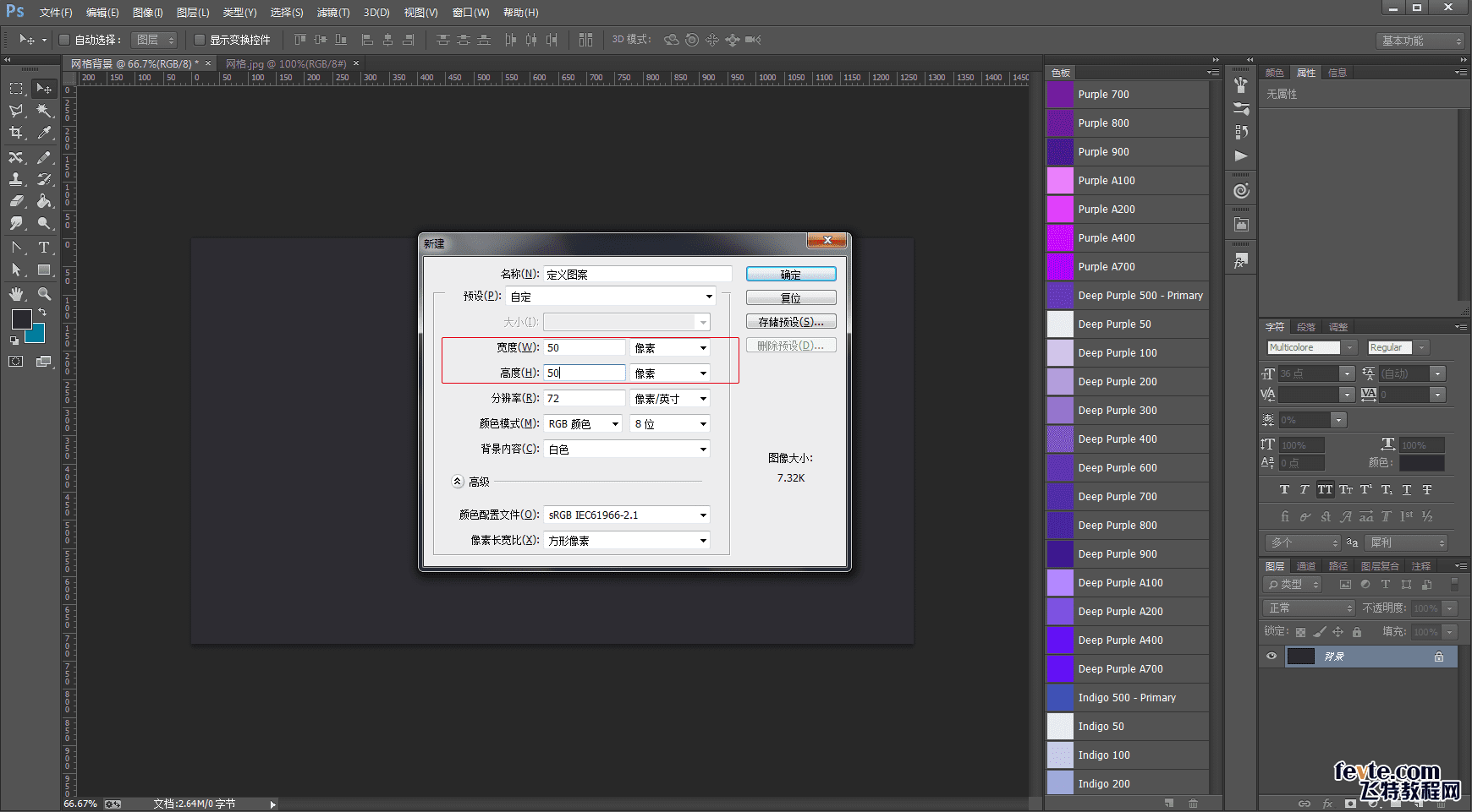 3,接下来干什么呢?画布建好了,当然是要画网格了,怎么画...........这就是教程开始的地方了,我们用定义图案的方法来完成网格绘制。所以,继续新建一个画布文档(50*50),如下图所示。