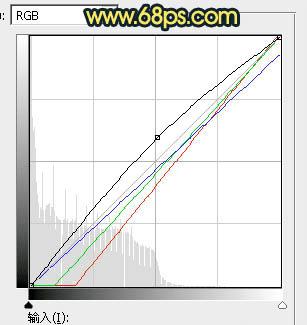 2、按Ctrl + Alt + 2 调出高光选区,按Ctrl + Shift + I 反选得到暗部选区,然后创建曲线调整图层,对RGB、红、绿、蓝通道进行调整,参数及效果如下图。这一步把暗部颜色稍微调亮,并增加绿色。