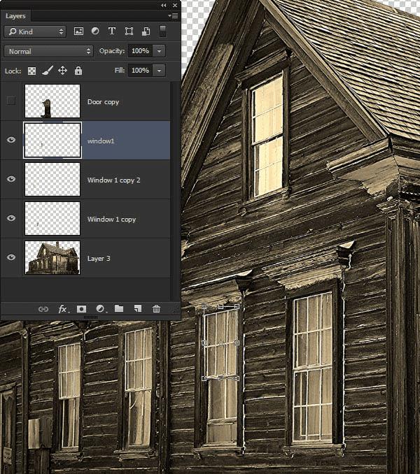 18、现在回过来对房子进行微微调整。我们回到房子,选取房子上面的窗子,复制并建立一个新的图层,图层--新建--通过拷贝的图层,然后将其移动到渐变雾图层的上层。