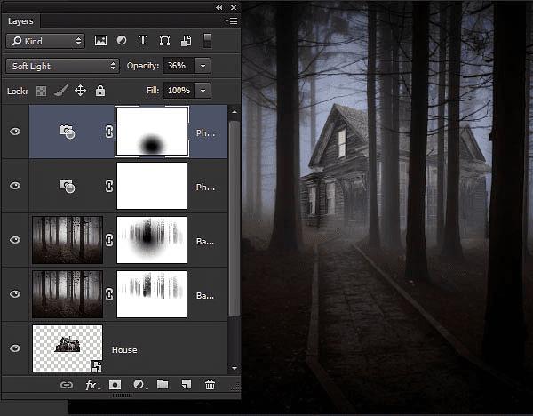 效果图用到的素材虽然不多,不过合成的时候作者在细节部分下了很多功夫。如:房子添加到森林的时候,需要用蒙版等控制房子显示的部分,并细调好颜色;为了模拟出夜色效果,还需给房子窗户增加灯光效果;后期还加入了一些恐怖相关的元素,并加强局部光感让整个作品更加有恐怖感。