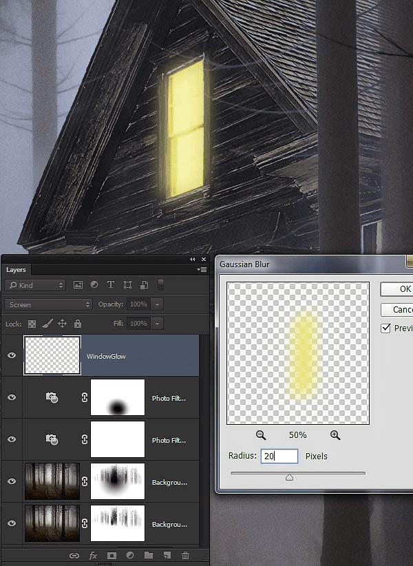 20、为了使光表现出神秘感,我们现在窗口的上层新建一个图层,然后将颜色设置为ebe47a,调整并填充窗口大小,并将模式设置为滤色模式,然后执行滤镜---模糊---高斯模糊,设置为20。