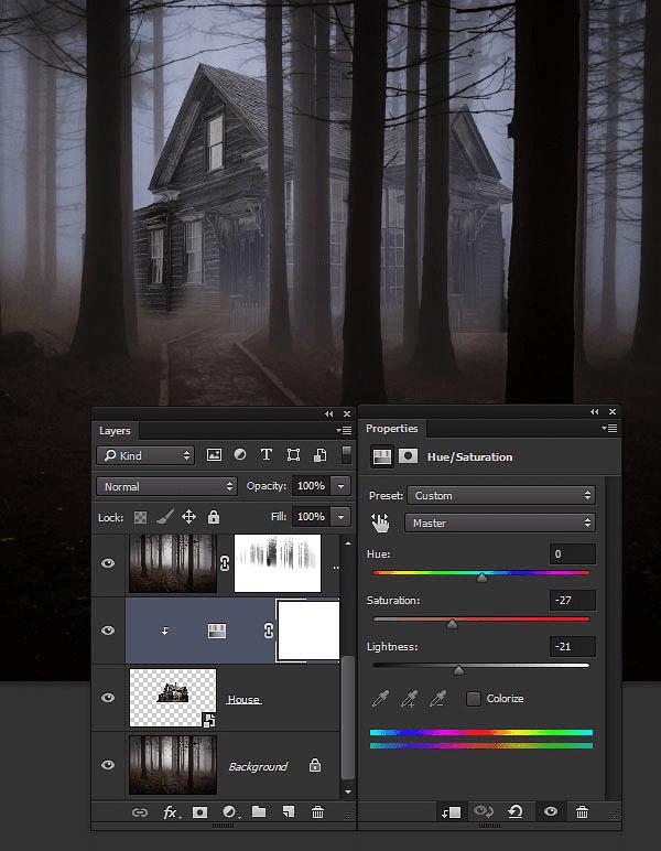 14、在置入的房子图层和复制的黑暗森林之间,添加一个色相饱和度图层。