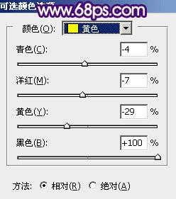 4、创建可选颜色调整图层,对黄色进行调整,参数设置如图12,确定后用黑色画笔把左侧部分擦出来,效果如图13。
