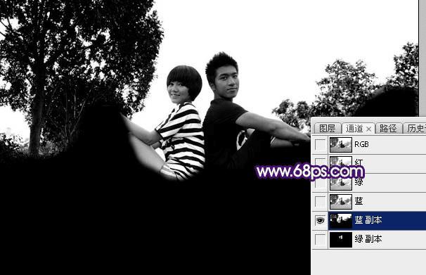 按住Ctrl 键鼠标左键点击蓝副本通道缩略图载入选区。