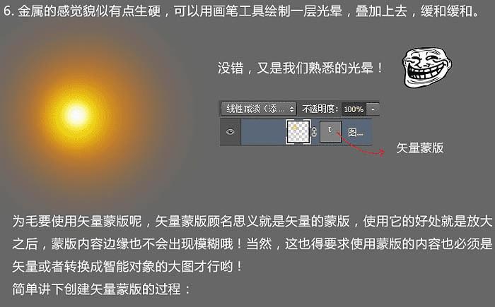 6、金属的感觉貌似有点生硬,可以用画笔工具绘制一层光晕,叠加上去。