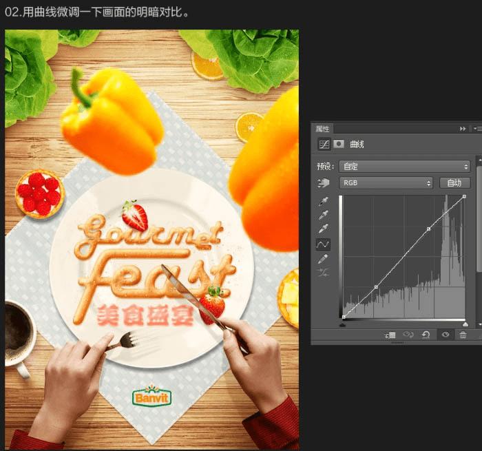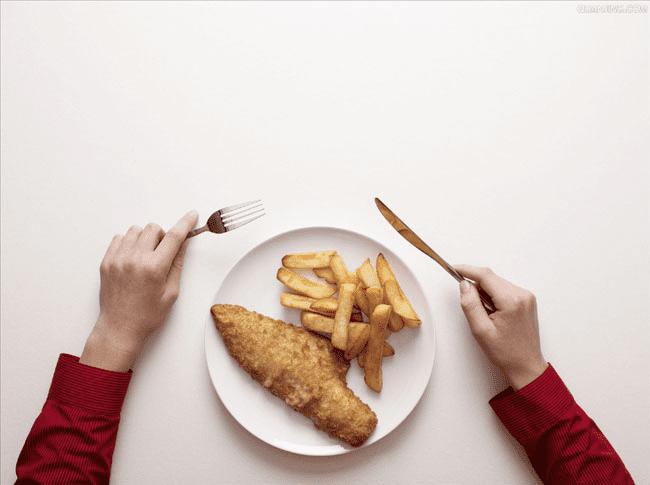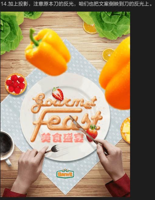 13、加上手拿刀叉的素材,摆放好位置,用中性灰修一下明暗对比。
