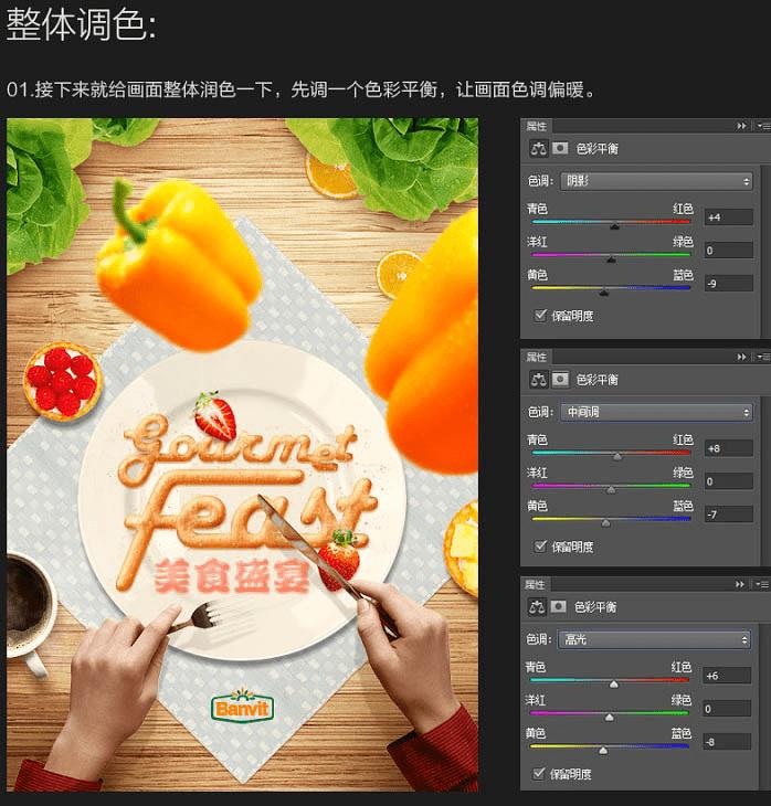 1、接下来就给画面整体润色一下,先调一个色彩平衡,让画面色调偏暖。