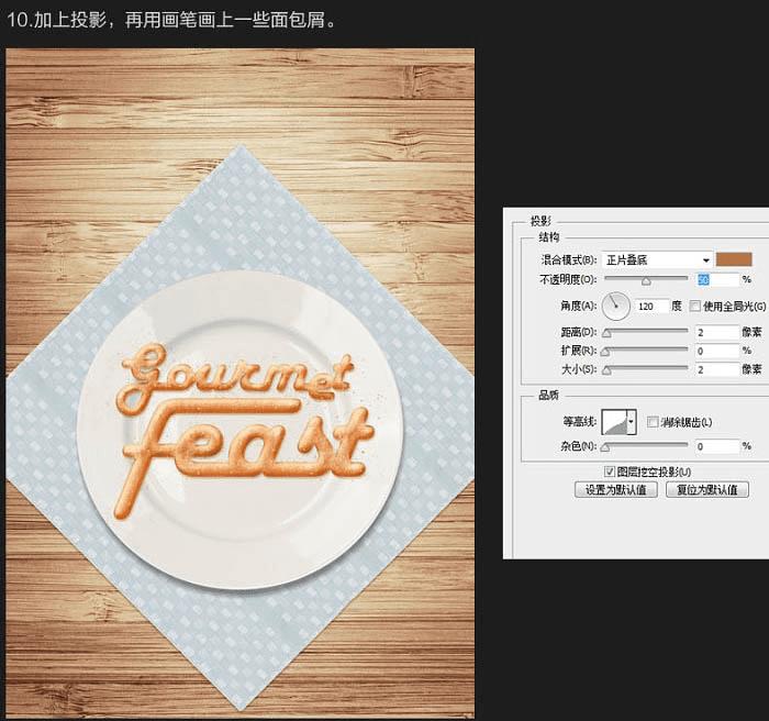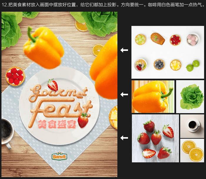 12、把美食素材放入画面中摆放好位置,给他们都加上投影。方向要统一。咖啡用白色画笔加一点热气。