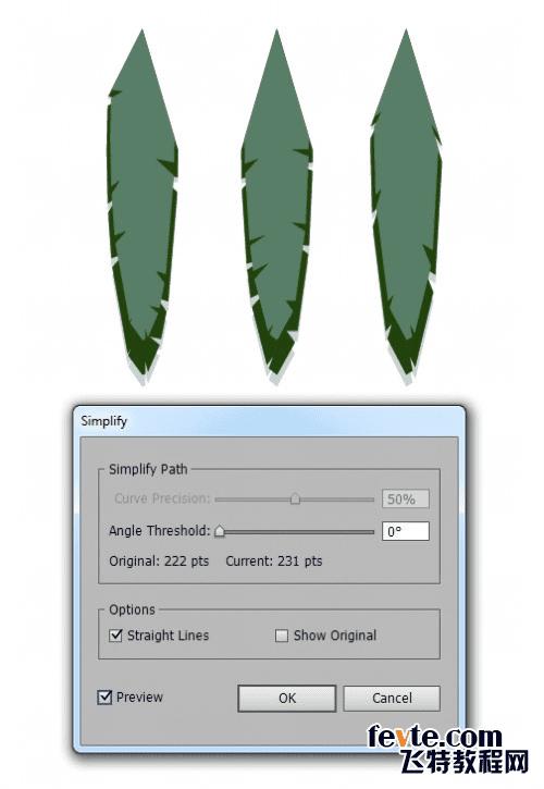 为了使羽毛更风格化一点,可以为他添加一些直角边界。选择所有(Ctrl+A),对象路径简化,输入如图所示对话框中的值。设置角度阔值为0度,确定。