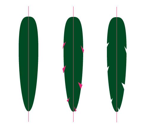 选择对象变形旋转,旋转90度。复制此形状三次。要利用这三个图形制作三种不同的羽毛笔刷,增加点多变性。使用线段工具,沿着中轴线画一条直线。选择所有三角形使用复合路径工具(ctrl+8).选择复合后的路径和椭圆形,使用路径查找器减去前面。