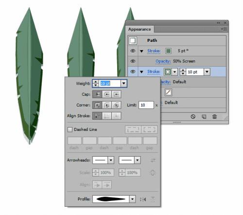 在羽毛的中间使用线段工具,画一条直线。在外观面板设置如图数值,复制该直线,将描边降低到5pt。改变混合模式为滤色,不透明度为50%.组合这些元素。