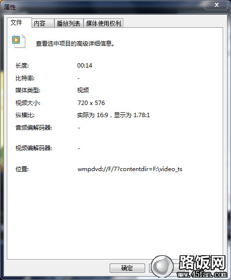 放入光盘,自动会启动Windows media player软件播放,这是后,点击菜单中的“文件”下面的“属性”,可以看到下面这个面板。特别是位置的那部分,暴露了视频的路径:“F:\video_te”。对,视频就在这个目录。