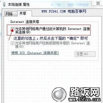 ⒈)在电脑桌面进入计算机,然后找到网络连接,再打开网络共享中心,选择已联网的如本地连接,然后在本地连接上右键单击鼠标,选择“属性”,之后点击“共享”,勾选“允许其他网络用户通过此计算机的Internet连接”选项后如下图:
