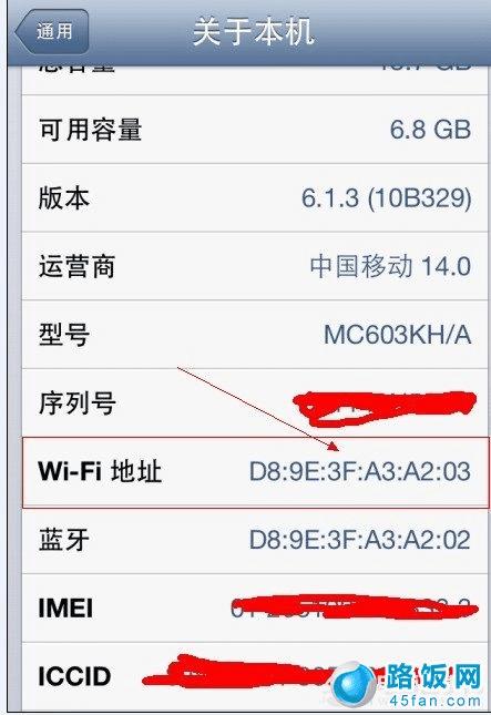 手机上的Mac地址怎么查看呢,以iPhone为例,“设置”--“通用”--“关于本机”--“Wifi地址”