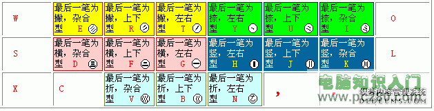 例如: “只” “叭”两个字的编码都是“ KW”,为了在打出KW编码后不要用数字键选字,,就必须再加打一个识别码, 以区分这两个字。“只”是上下结构,同时,它的最后一笔是点,那它的识别码就是“U”, “叭”,它的最后一笔是也是点,但它是左右结构,它的识别码是“Y”,这样就把这两个字区分开来了, “只”的编码是KWU “叭”的编码是KWY ,如果您还不明白,不要急!请您看下面的表格您会很快懂的。