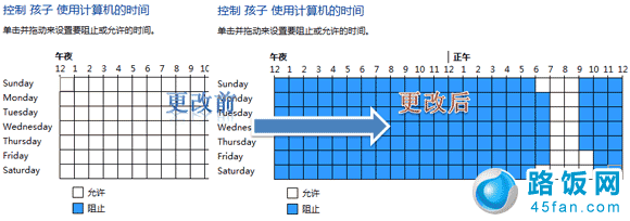 时间限制: (设置一),通常情况下考虑孩子要上学,所以白天基本上可以阻止孩子上网,晚上呢也不要玩得太晚,所以一般安排个2~3小时比较合理,双休日适当放宽,这些都由家长自己设置,小易做了如下设置: