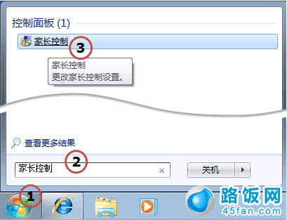 单击开始, 在命令框里面输入 家长控制 并在命令行结果集里面单击家长控制,如下图所示: