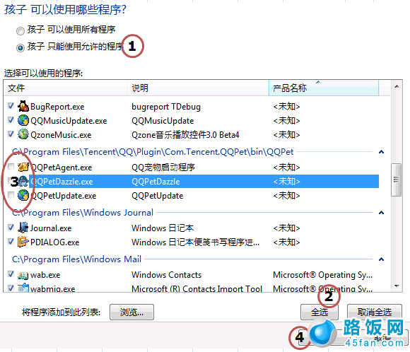 允许和阻止特定程序:(设置三)。对于家长已经在机子上安装某些不适合孩子用的程序的时候,可以采用下面的程序限制阻止孩子运行。允许运行的程序设置如下,家长们只需要选定将要允许运行的程序,或是在自己安装的不适合孩子的游戏程序前取消打钩,并单击确定即可,设置如下: