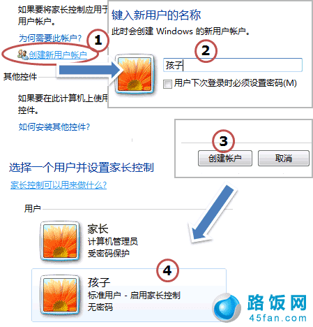 在家长控制对话框里,点击位于中间的创建新用户帐户。然后在弹出的创建用户窗口,键入新用户的名称 孩子 ,并点创建帐户按钮即可完成。如下图所示,创建了一个叫做孩子的用户供孩子使用,这个时候您的计算机应该有两个账户,一个是您作为家长的管理员账号,另一个叫做孩子的账户则是给您的孩子使用。