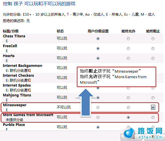 注意: 不给玩游戏一般是不可能的,孩子也不答应,所以建议家长还是允许孩子玩一些游戏。如果只允许孩子玩特定的游戏,家长控制提供家长以下两个选择,如右图所示: