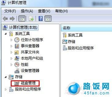 2、在弹出来的窗口中,我们点击磁盘管理,这样,我们就可以看到现在的win7电脑分区情况。