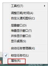 1、在任务栏显示时间的位置点击右键,选择属性。