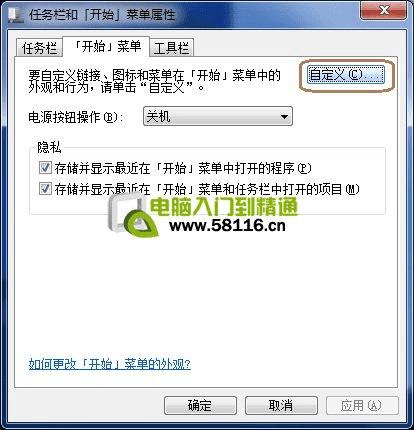 2.单击“「开始」菜单”选项卡,然后单击“自定义”。