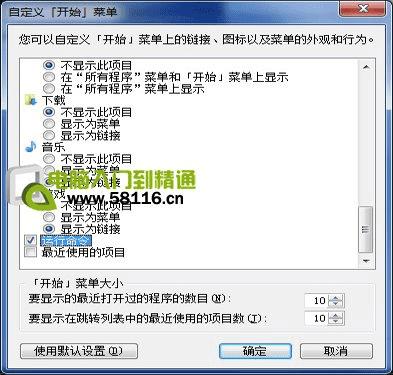 3.在「开始」菜单选项列表中,选中“运行命令”复选框,然后单击“确定”。“运行”命令将显示在「开始」菜单的右侧。