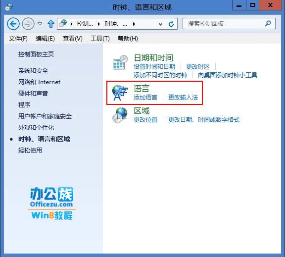 按Win+i组合键,打开Windows8控制面板,选择时钟、语言和区域。