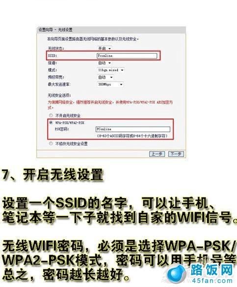 接下来进入无线设置,设置SSID名称,这一项默认为路由器的型号,这只是在搜索的时候显示的设备名称,可以根据你自己的喜好更改,方便搜索使用。其余设置选项可以根据系统默认,无需更改,但是在网络安全设置项必须设置密码,防止被蹭网。设置完成点击下一步。