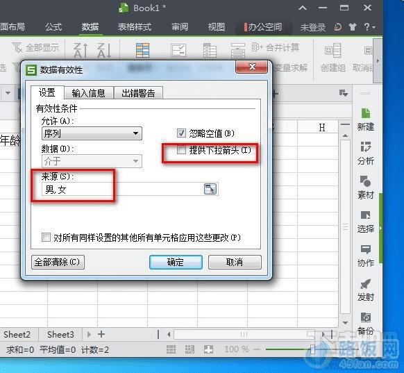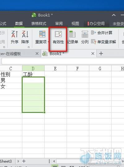 1:比如性别。选择需要输入的单元格。点击---数据---有效性
