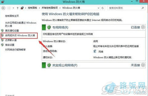 2、点击左侧的“启用或关闭Windows防火墙”