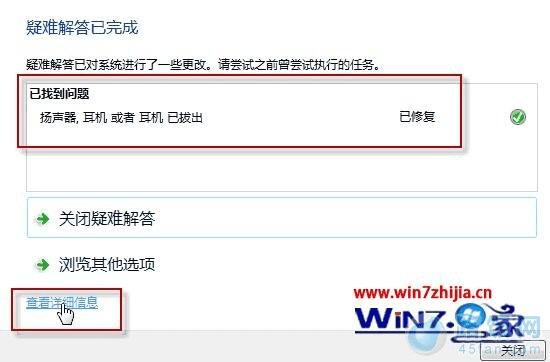 4、这时候如果插入耳机或扬声器,并点击下一步按钮,系统会自动更改修复,并提示修复完成。