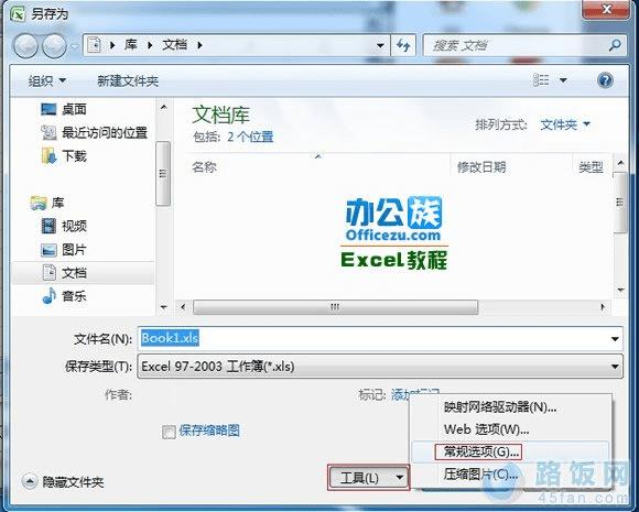 2、 在“另存为”界面左下角有一个“工具”按钮,点击“工具”按钮右边的小三角,在弹出菜单中选择“常规选项”。