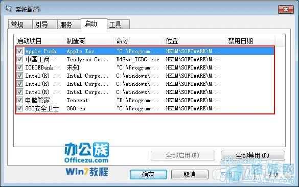 3、 在“启动”栏中我们可以看到很多软件都在启动时会加载导致系统启动缓慢。