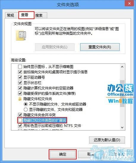 2、 打开“文件夹选项”点击“查看”并找到“隐藏已知文件类型的扩展名”将其勾掉,在单击“确定”。